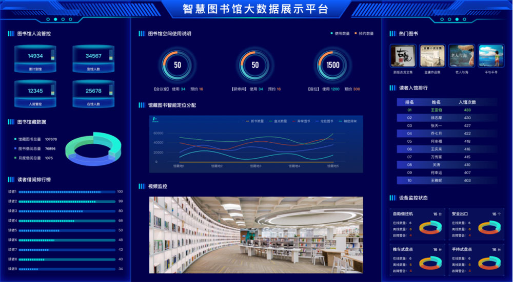 1.可以展示圖書館人流管控、圖書館藏數據讀者借閱排行。