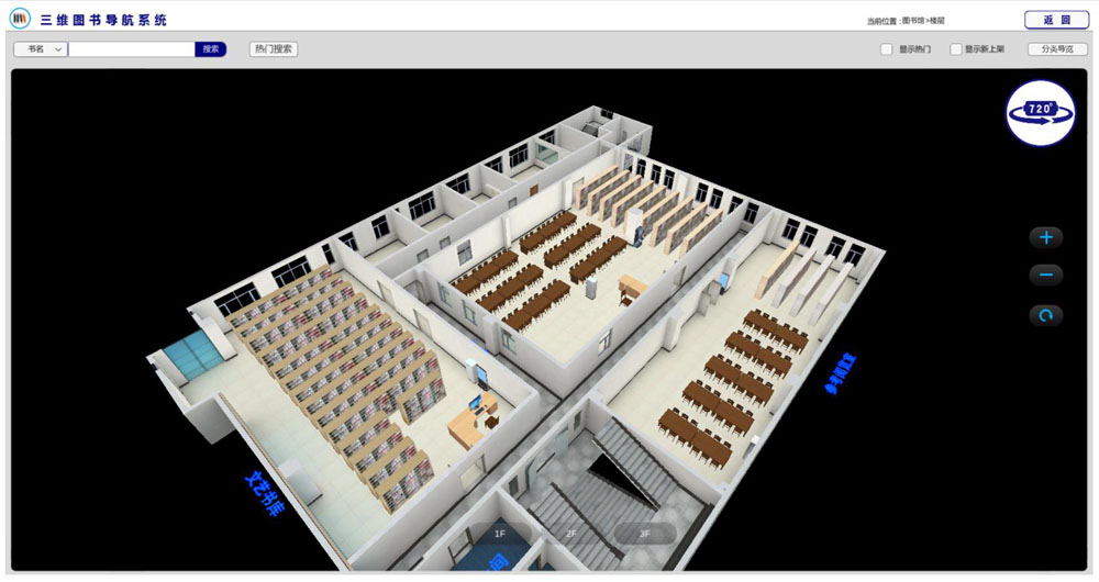 將線下圖書館現有的資源(包括館內圖書、設備、空間布局、裝修風格、家具等)進行線上虛擬可視化展示,仿真讀者在線下瀏覽圖書時的真實場景。